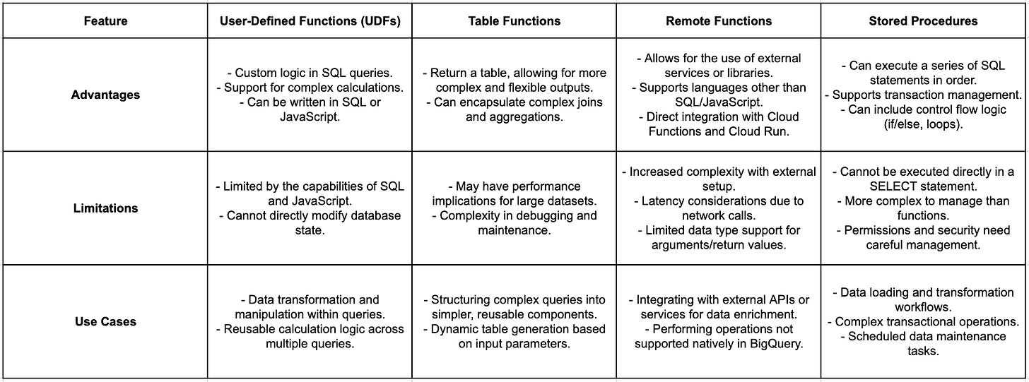Functionality: Allows implementing functions in languages beyond SQL and JavaScript, or using libraries/services not permitted in BigQuery's UDF.